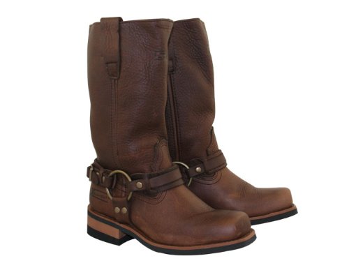 Womens Classic Harness Boot featuring dark brown color leather uppers (very hard to find). The more the boots are scuffed the tougher they look, 1 1/2 inch wooden rubber heel, and 11 inch upper, overall height of 13 Inches, side adjustable strap, good year welt construction for long durable wear. X-element provide bikers real protection, flexibility, comfort, and long term durability of all their products. Good Year Welt Construction boots (long term durability, resole-able, better comfort when wore in). Buy with confidence from the webs most popular leather store and save hundreds off the retail price.