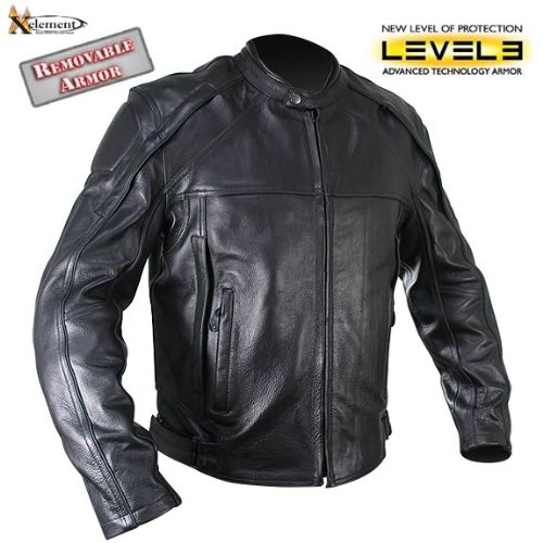 New from Xelement, the Naked Cowhide Black Leather Motorcycle Jacket with Level 3 Armor. This jacket is fully loaded with features, it has removable CE Approved Level-3 armor on the shoulders and elbows (New Level Of Protection by Level-3 Armor , Lighter Weight, Less Bulky, Level-3 Armor provides Highest CE Approved Protection, Ergonomic Design, Higher Impact Absorption, Free Movement), reflective piping for maximum visibility, removable insulating liner, back and front zippered vents for airflow, zippered cuffs, and much more for a low price. Buy with confidence today at the #1 leather store online!