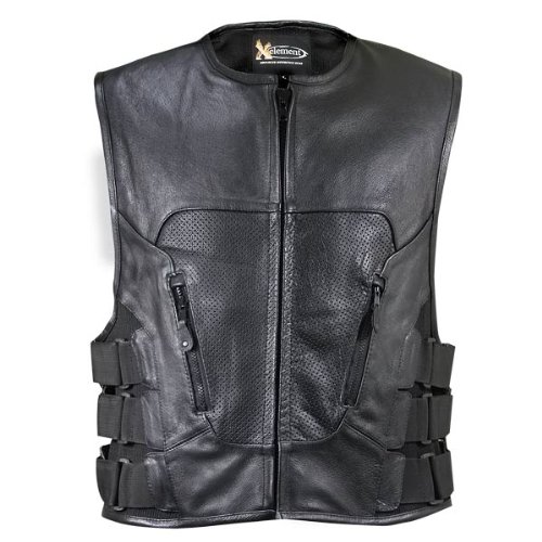Riding convenience, safety, and cool design are the main attributes of this biker leather vest by Xelement. The XS-1467 features advanced ergonomic triple velcro strap design with stretch panels on each side for a comfortable fit, zip-out hard back armor, perforated leather panels in front, two front hand pockets and one additional interior pocket.